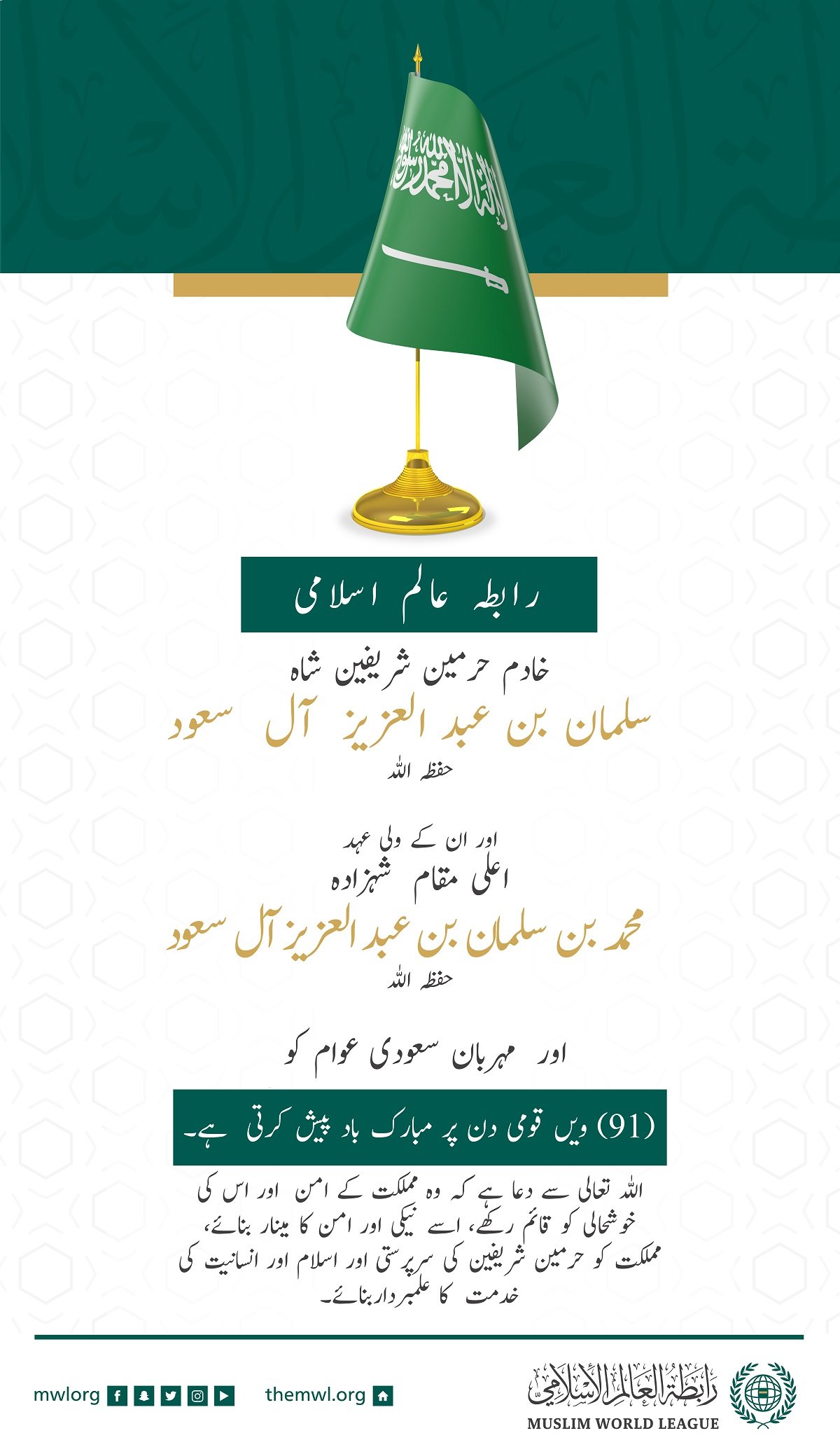 رابطہ عالم اسلامی خادم حرمین شریفین اور ان کے ولی عہد "حفظہما اللہ" اور عزیز سعودی عوام کو مملکت کے 91 ویں یوم الوطنی کے موقع پر مبارکباد پیش کرتی ہے۔