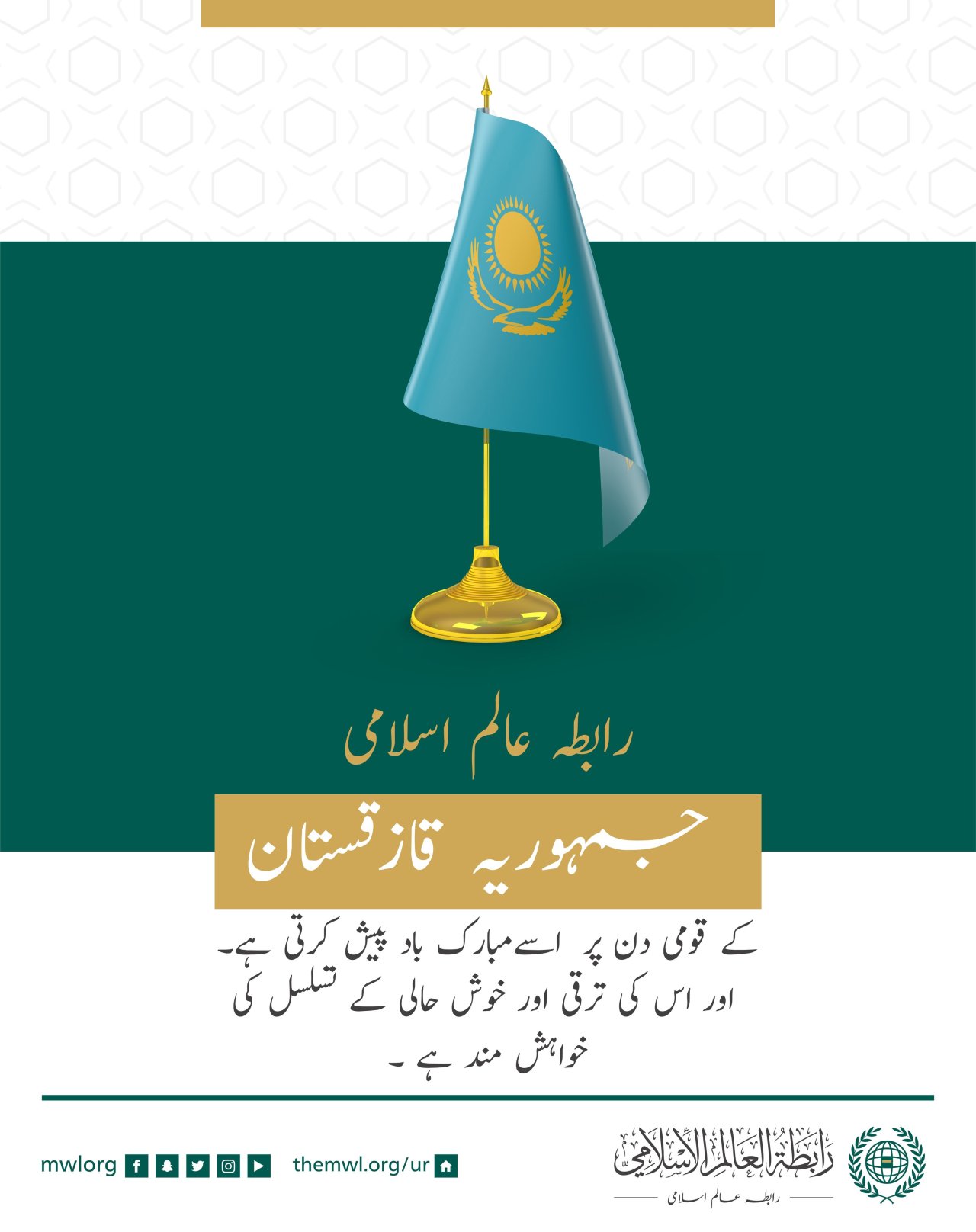 رابطہ عالم اسلامی کی طرف سے جمہوریہ قازقستان کے قومی دن کے موقع پر مبارکباد کا پیغام:
