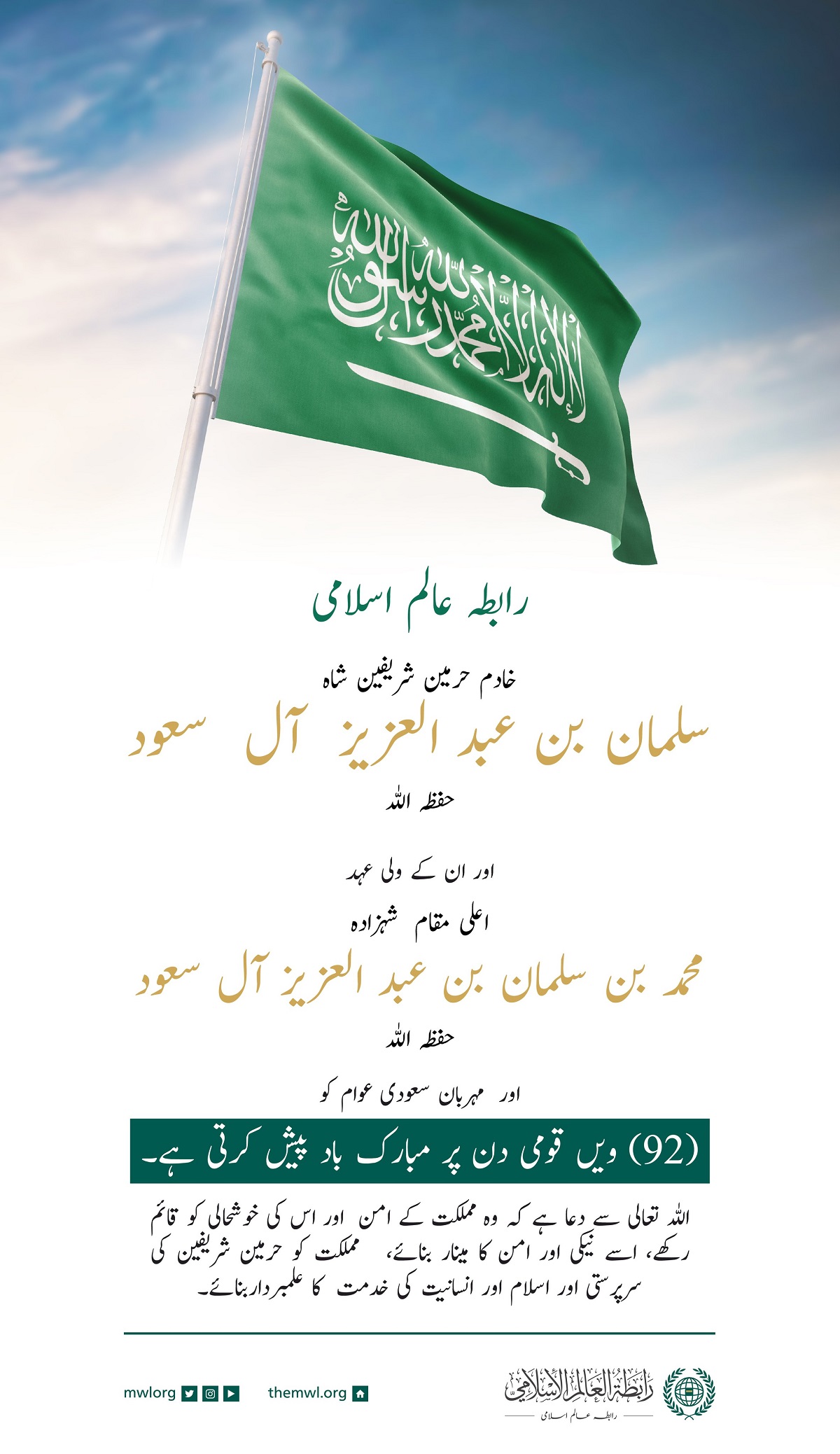 رابطہ عالم اسلامی خادم حرمین شریفین اور ان کے ولی عہد "حفظہما اللہ" اور عزیز سعودی عوام کو مملکت کے 92 ویں یوم الوطنی کے موقع پرمبارکباد پیش کرتی ہے۔
