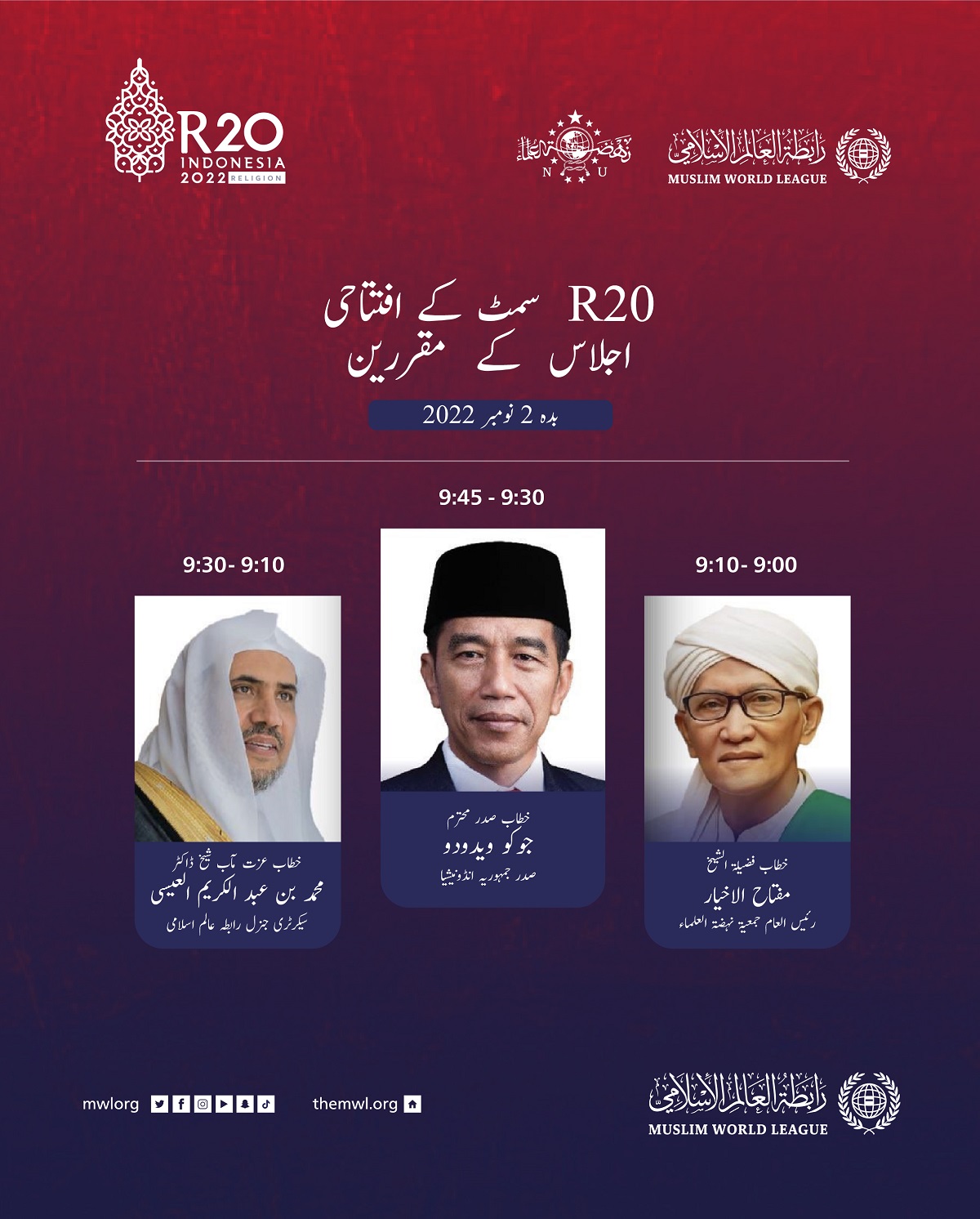 بین المذاہب سربراہی اجلاس (R20) کا افتتاح مشاہدہ فرمائیں..(G20)گروپ کے ایجنڈے میں پہلا مذہبی سمٹ.. رابطہ عالم اسلامی اور نہضۃ العلماء کے زیر اہتمام اس سمٹ کی سرپرستی انڈونیشیا کے صدر کرررہے ہیں۔