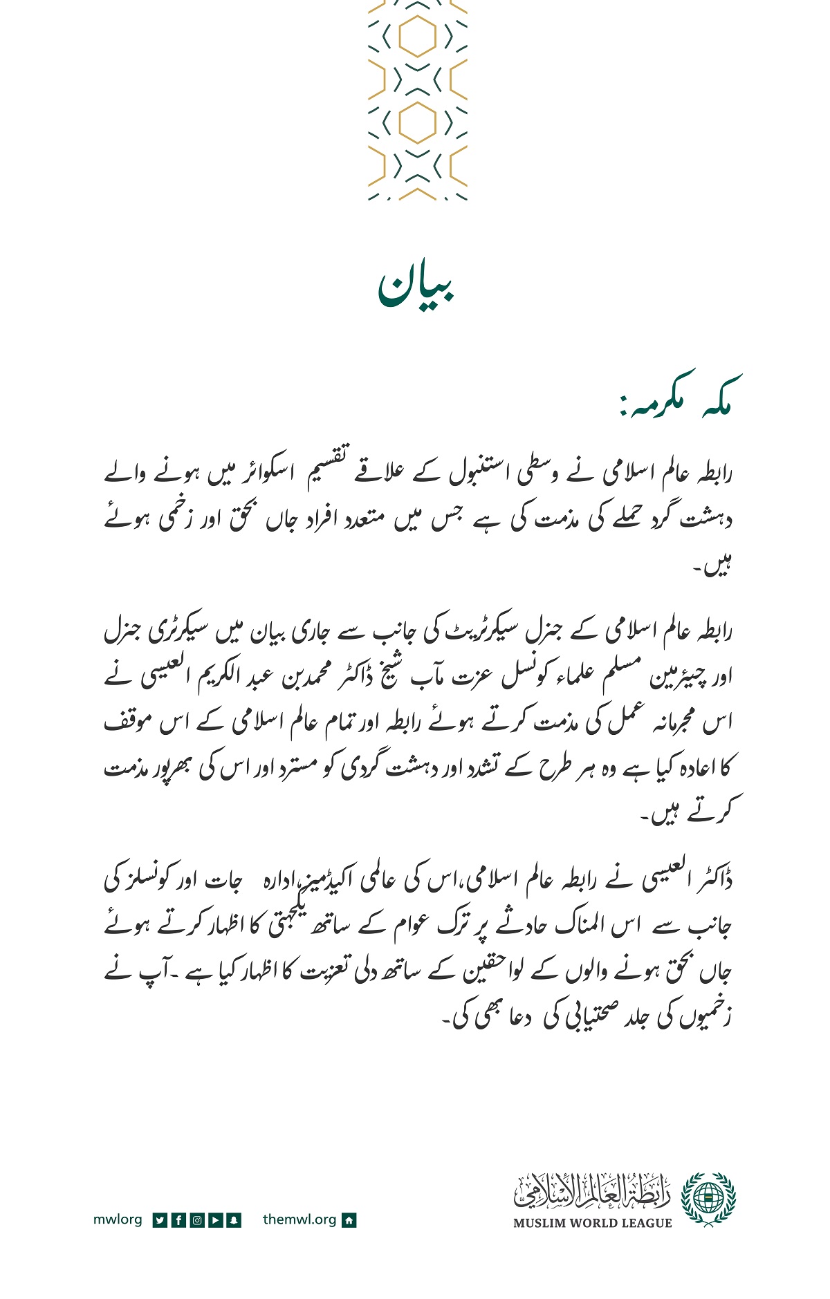 رابطہ عالم اسلامی کے جنرل سیکرٹریٹ کی جانب سے جاری بیان میں سیکرٹری جنرل اور چیئرمین مسلم علماء کونسل عزت مآب شیخ ڈاکٹر محمدبن عبد الکریم العیسی نے اس مجرمانہ عمل کی مذمت کرتے ہوئے رابطہ اور تمام عالم اسلامی کے اس موقف کا اعادہ کیا ہے وہ ہر طرح کے تشدد اور دہشت گردی کو مسترد اور اس کی بھرپور مذمت کرتے ہیں۔