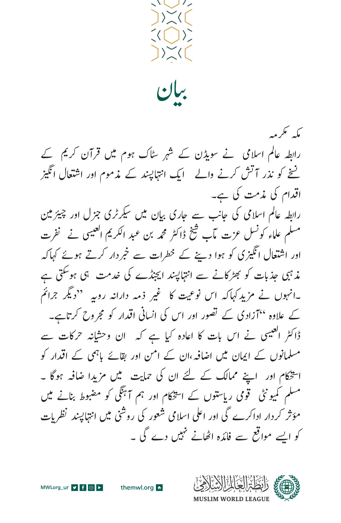 رابطہ عالم اسلامی کی جانب سے جاری بیان: