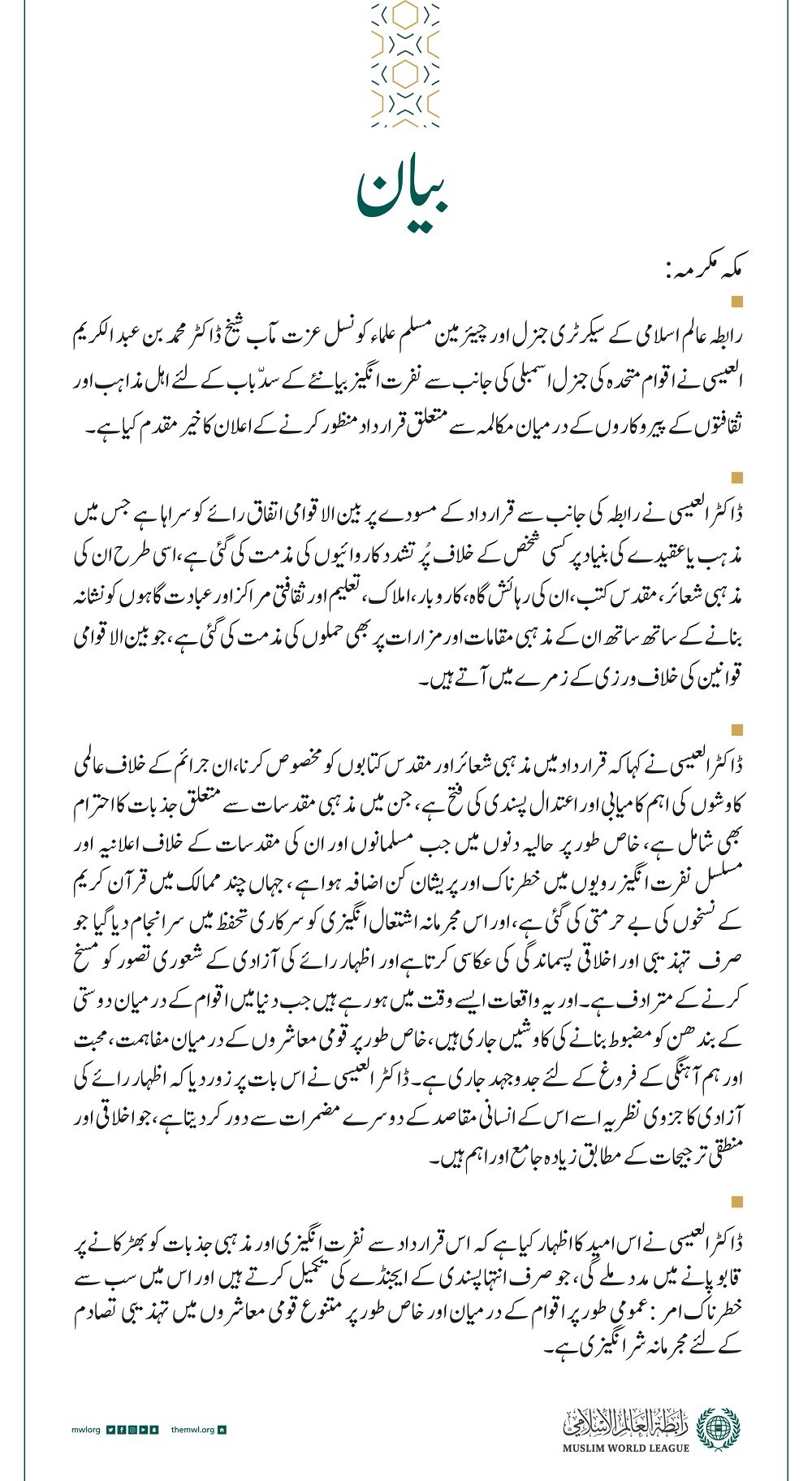 ڈاکٹر العیسی نے رابطہ کی جانب سے قرارداد کے مسودے پر بین الاقوامی اتفاق رائے کوسراہا ہے جس میں مذہب یا عقیدے کی بنیاد پر کسی شخص کے خلاف پُر تشدد کاروائیوں کی مذمت کی گئی ہے،اسی طرح ان کی مذہبی شعائر،مقدس کتب،ان کی رہائش گاہ،کاروبار،املاک،تعلیم اور ثقافتی مراکز اور عبادت گاہوں کو نشانہ بنانے کے ساتھ ساتھ ان کے مذہبی مقامات اور مزارات پر بھی حملوں کی مذمت کی گئی ہے ،جو بین الاقوامی قوانین کی خلاف ورزی کے زمرے میں آتے ہیں۔