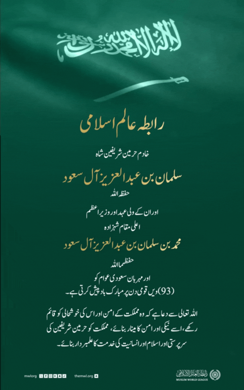 رابطہ عالم اسلامی خادم حرمین شریفین اور ان کے ولی عہد "حفظہما اللہ" اور عزیز سعودی عوام کو مملکت کے 93 ویں یوم الوطنی کے موقع پرمبارکباد پیش کرتی ہے۔