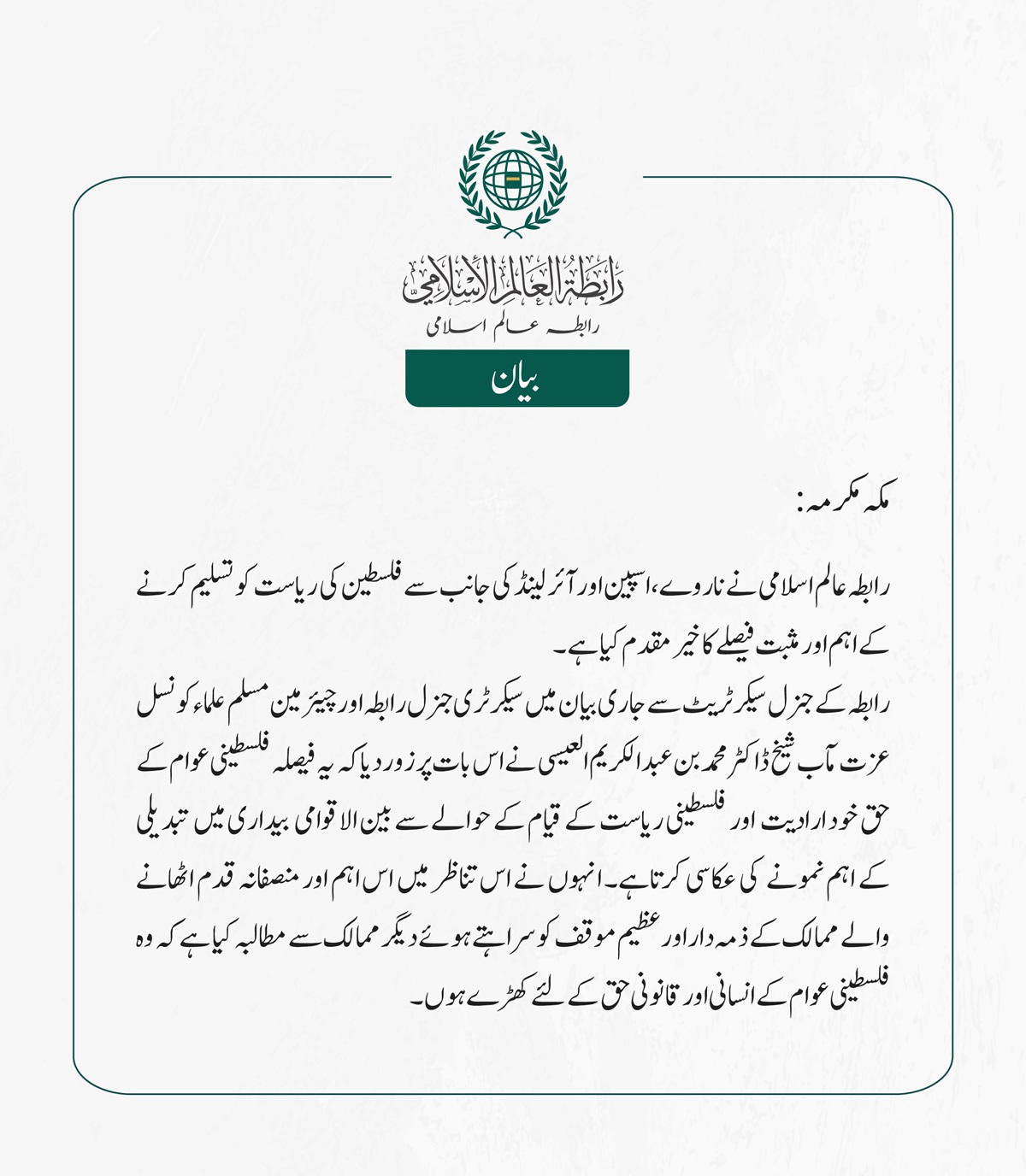 رابطہ عالم اسلامی نے ناروے،اسپین اور آئرلینڈ کی جانب سے فلسطین کی ریاست کو تسلیم کرنے کے اہم اور مثبت فیصلے کا خیر مقدم کیا ہے۔
