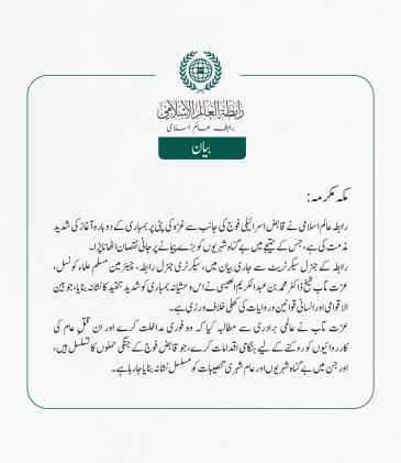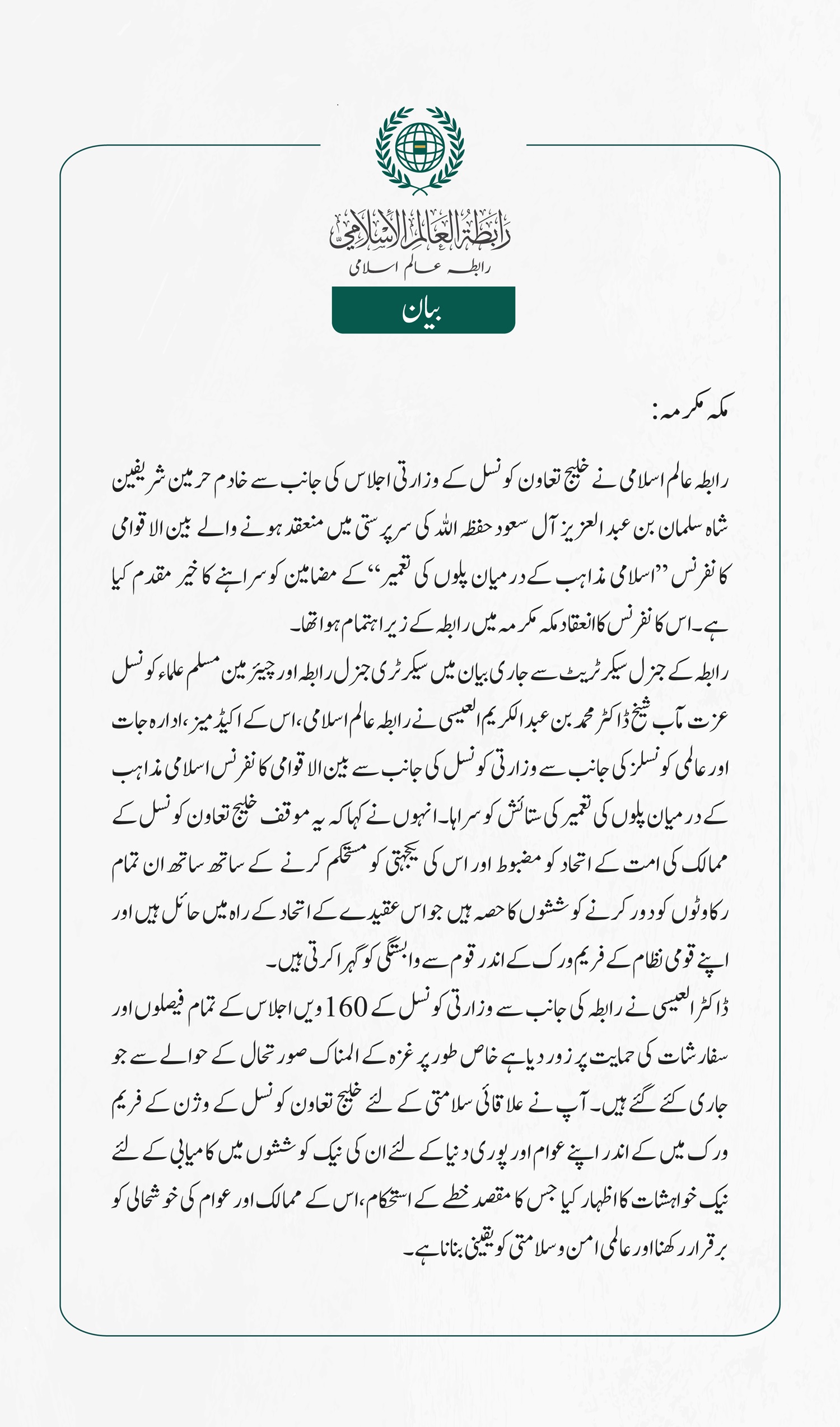 ڈاکٹر العیسی نے رابطہ کی جانب سے وزارتی کونسل کے 160 ویں اجلاس کے تمام فیصلوں اور سفارشات کی حمایت پر زور دیاہے خاص طور پر غزہ کے المناک صورتحال کے حوالے سے جو جاری کئے گئے ہیں۔ آپ نے علاقائی سلامتی کے لئے خلیج تعاون کونسل کے وژن کے فریم ورک میں کے اندر اپنے عوام اور پوری دنیا کے لئے ان کی نیک کوششوں میں کامیابی کے لئے نیک خواہشات کا اظہار کیا جس کا مقصد خطے کے استحکام،اس کے ممالک اور عوام کی خوشحالی کو برقرار رکھنا اور عالمی امن وسلامتی کو یقینی بناناہے۔