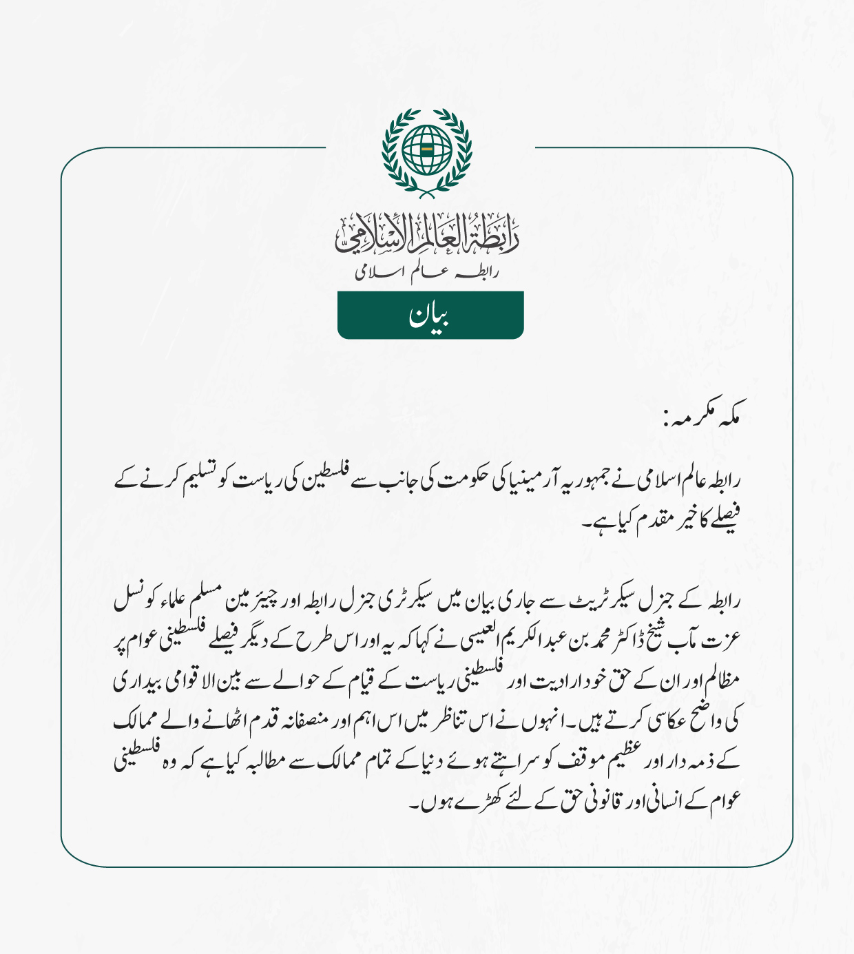 رابطہ عالم اسلامی نے جمہوریہ آرمینیا کی حکومت کی جانب سے فلسطین کی ریاست کو تسلیم کرنے کے فیصلے کا خیر مقدم کیا ہے۔