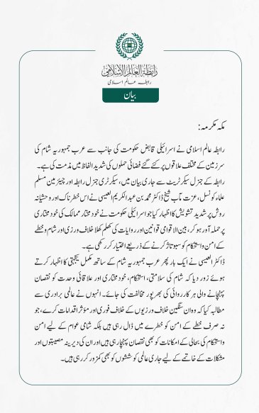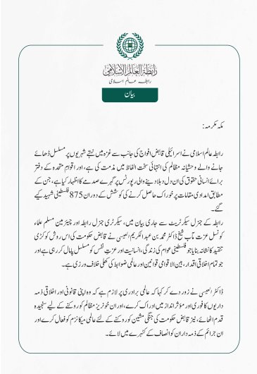 رابطہ کے جنرل سیکرٹریٹ سے جاری بیان میں سیکرٹری جنرل رابطہ اور چیئرمین مسلم علماء کونسل، عزت مآب شیخ ڈاکٹر محمد بن عبد الکریم العیسیٰ نے ان معاندانہ اور بے بنیاد اقدامات کی مذمت کی جو اسلامی مقدسات کی حرمت کو پامال کرتے ہیں۔ انہوں نے قابض افواج کی جانب سے تمام بین الاقوامی اور انسانی قوانین اور روایات کی خلاف ورزیوں کے جاری رہنے کے خطرات سے خبردار کرتے ہوئے، دنیا بھر کے مسلمانوں کے جذبات کو مجروح کرنے پر تشویش کا اظہار کیا۔