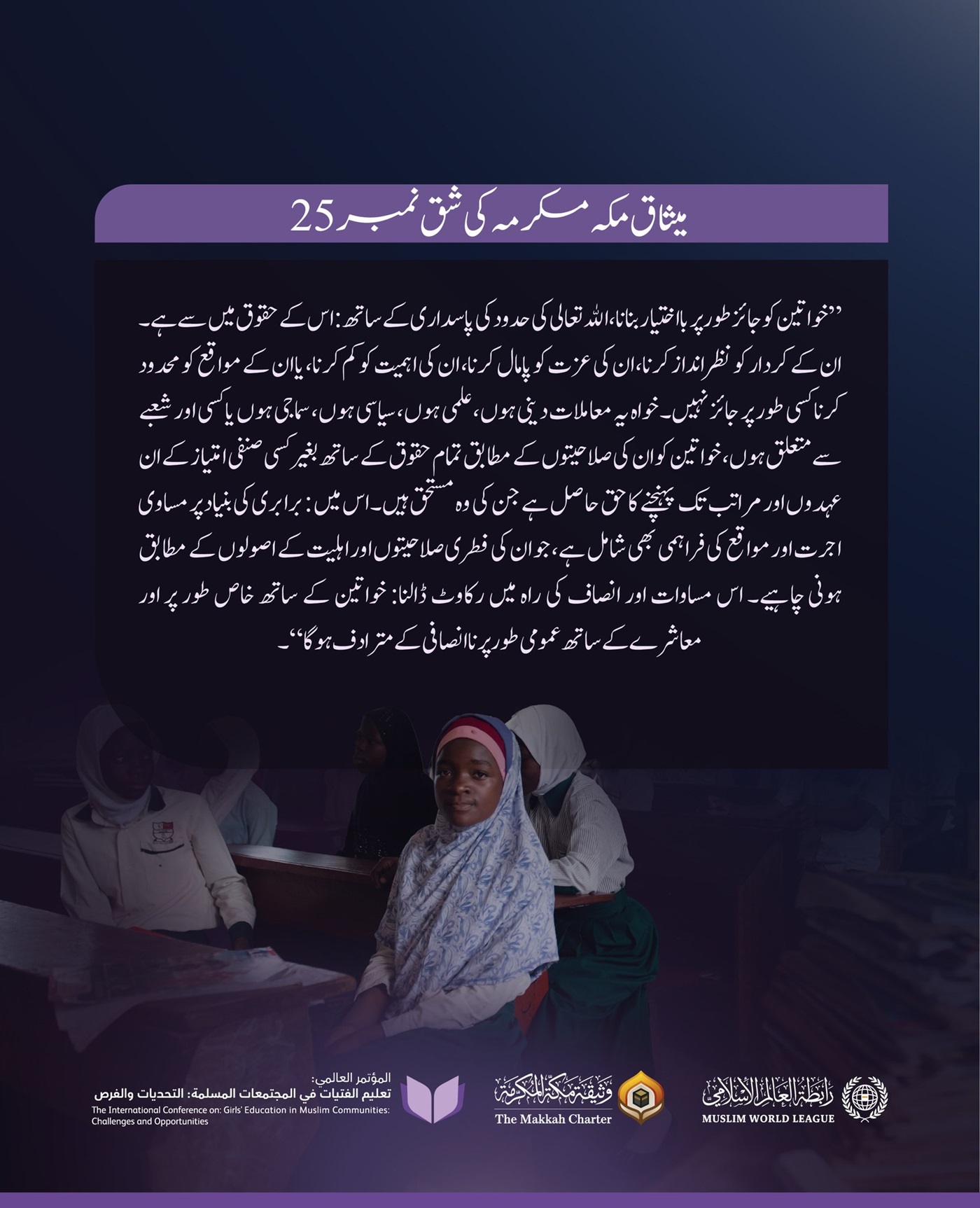 میثاق مکہ مکرمہ میں خواتین کا مقام، امت کے نامور علمائے کرام اور مفتیان عظام کی تائید کے ساتھ: مكمل اور جائز حقوق۔ اور تعلیم اس سے مستثنیٰ نہیں! #لڑکیوں_کی_تعلیم_کے_لئے_اقدام