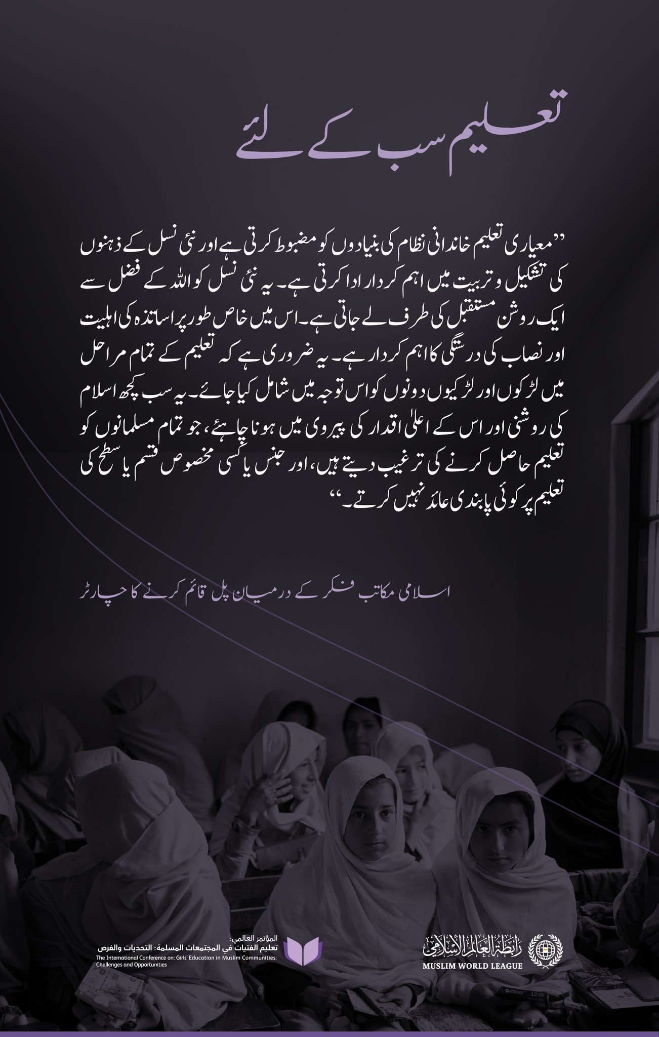 بلا امتیاز سب کے لئے تعلیم کا حق، جسے ”اسلامی مکاتب فکر کے درمیان پُل قائم کرنے کے چارٹر“ نے غیر معمولی اجماع کے ساتھ تمام اسلامی تنوع کے اتفاق رائے سے تسلیم کیا ہے: