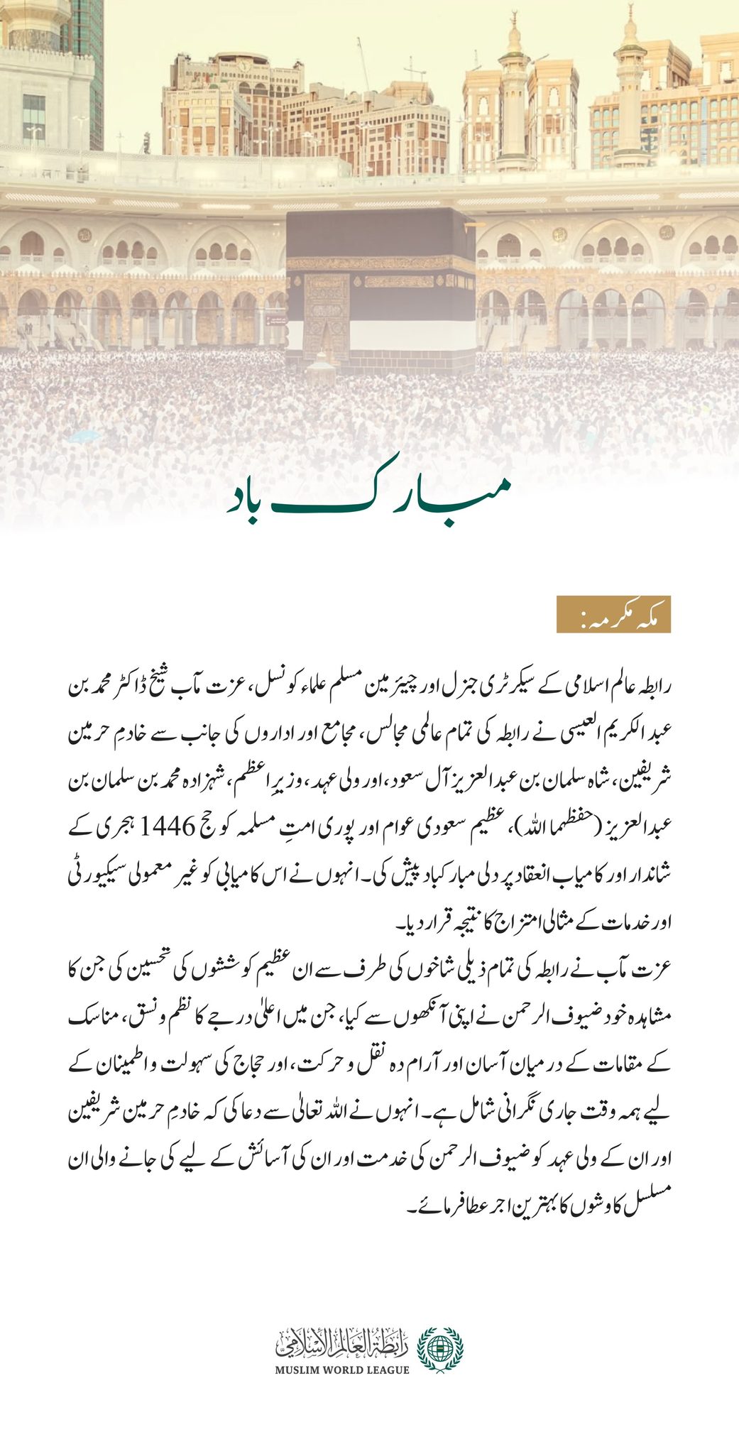 رابطہ عالم اسلامی کی جانب سے حج 1446ھ کے کامیاب انعقاد پر مبارکباد کا پیغام: