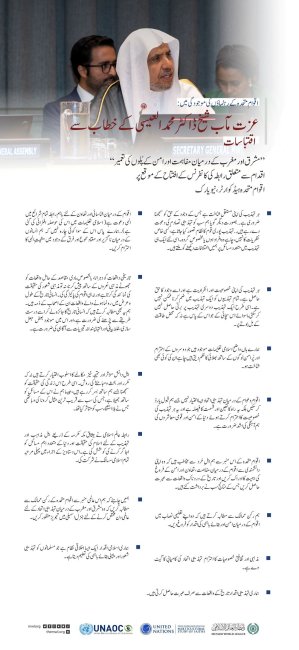 نیویارک میں اقوام متحدہ کے ہیڈ کوارٹر سے”مشرق اور مغرب کے درمیان مفاہمت اور امن کے پُلوں کی تعمیر“ کے لئے رابطہ عالم اسلامی کے اقدام کے آغاز کے موقع پر،رابطہ عالم اسلامی کے سیکرٹری جنرل اور چیئرمین مسلم علماء کونسل شیخ ڈاکٹر محمد العیسی کے خطاب سے اقتباس